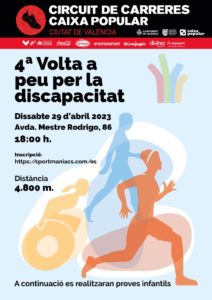 La Fundación Deportiva Municipal, con la colaboración de la Oficina Municipal de Atención a Personas con Discapacidad, organiza la 4ª Volta a Peu per la Discapacitat Ciudad de València, cuarta prueba del 18º Circuito de Carreras Caixa Popular Ciutat de València, cuyo plazo de inscripción se abrió el pasado 27 de marzo.